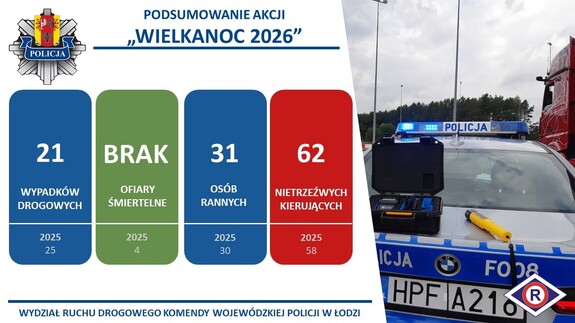 Od 3 do 6 kwietnia 2026 roku policjanci ruchu drogowego na terenie województwa łódzkiego prowadzili wzmożone działania kontrolno-prewencyjne pod nazwą „Wielkanoc 2026”, których celem było zapewnienie bezpieczeństwa wszystkim uczestnikom ruchu drogowego w okresie świątecznym.