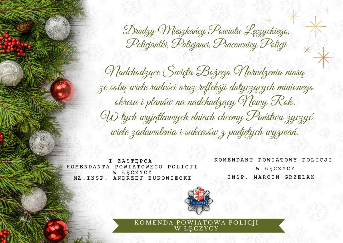 Życzenia od kierownictwa Komendy Powiatowej Policji w Łęczycy Powrót Drukuj "Drodzy Mieszkańcy Powiatu Łęczyckiego, Policjanci, Policjantki, Pracownicy Policji..."