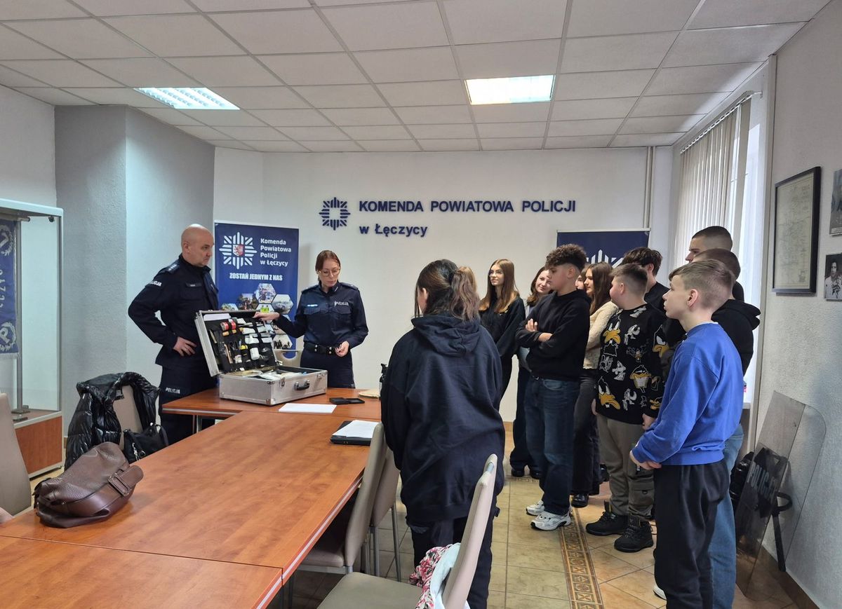 28 stycznia 2026 roku w sali odpraw łęczyckiej komendy odbyła się lekcja z doradztwa zawodowego skierowana do uczniów klas 8. W trakcie zajęć przyszli absolwenci dowiedzieli się między innymi czym zajmuje się na co dzień policja i z jaką odpowiedzialnością wiąże się ta służba. Słuchaczom wyjaśniono specyfikę pracy dzielnicowego oraz czym zajmuje się „drogówka”. Nie zabrakło informacji o stróżach prawa niekorzystających na co dzień z mundurów. Poza omówieniem poszczególnych pionów służby policji, większość spotkania poświęcono tematyce związanej z procesem rekrutacji oraz wymaganiom, które musi spełnić przyszły kandydat. Omawiając poszczególne etapy rekrutacji policjanci radzili jaką ścieżkę nauki wybrać, która ułatwi im wstąpienie w szeregi tej formacji. Dużą atrakcją były praktyczne zajęcia z technikiem kryminalistyki. Ośmioklasiści mogli wcielić się w jego rolę poznając specyfikę tej służby.