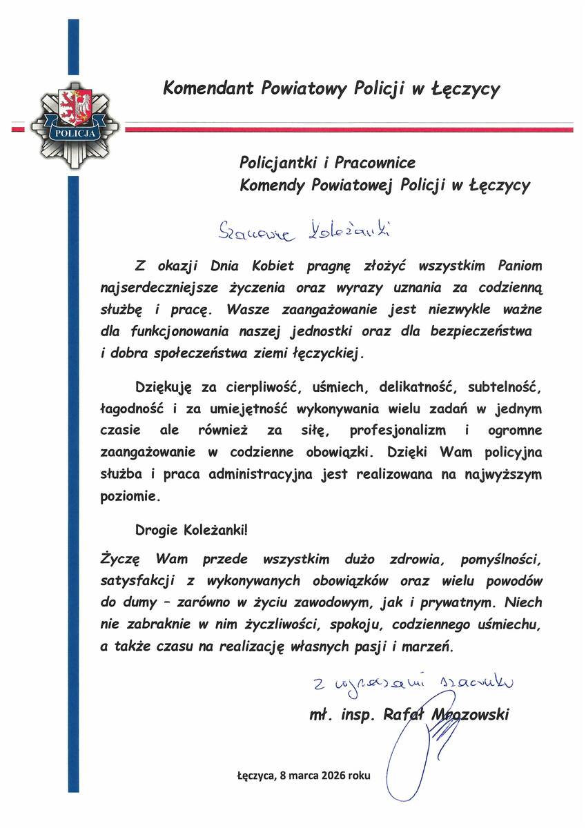 Życzenia Komendanta Powiatowego Policji w Łęczycy z okazji Dnia Kobiet